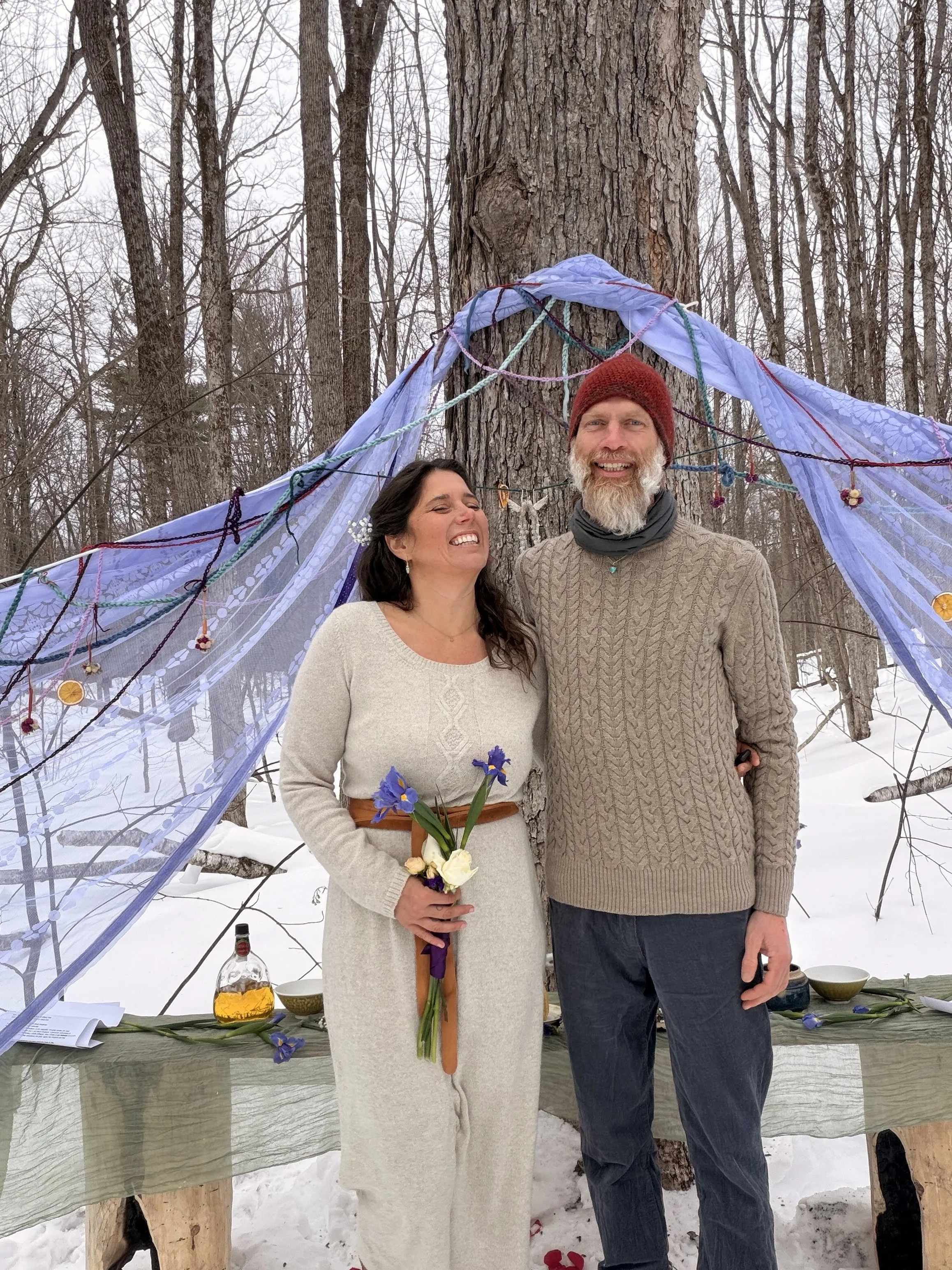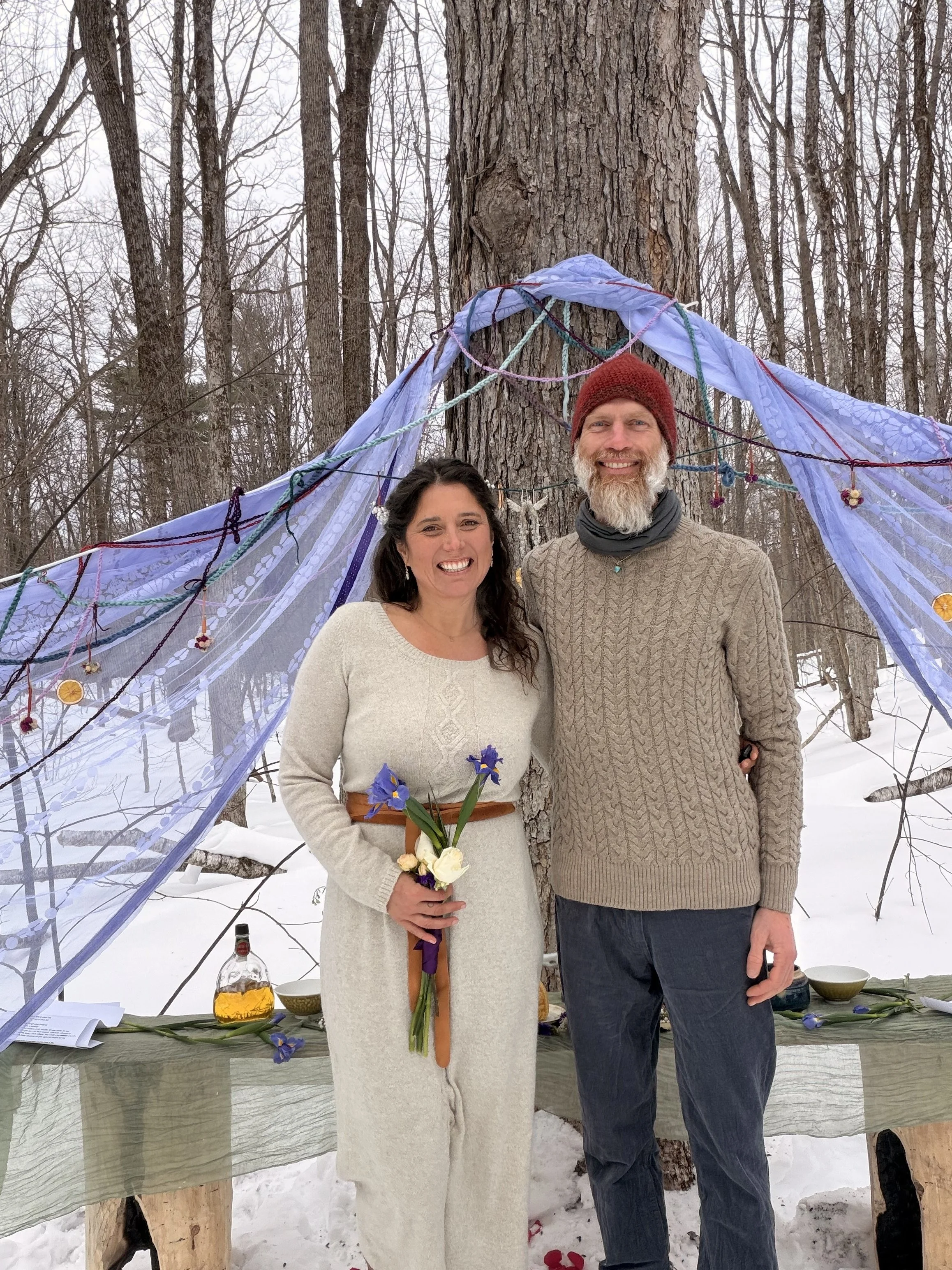 We went to our favorite tree on Bird Hill, a beautiful old sugar maple we knew we wanted to get married under. We wrote our vows together, and created a ritual of pouring salt into a container to symbolize our lives joining together. We then we went to the Berkshire mountains where our friend Rev Mike Denton officially pronounced us husband and wife on the frozen waters of Lake Onota.